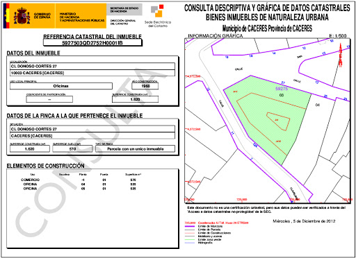 Y me he llevado alguna sorpresa. Por ejemplo, que la ficha catastral del inmueble está coja. Se trata, según la información pública del Catastro, de una parcela con un único inmueble, construido sobre una superficie de 570 m2 y con una superficie construida de 1.620 m2. En la ficha catastral, es curioso, el edificio consta de Planta -1, con 570 m2, y uso comercio, y dos plantas, 04 y 05, de 525 m2 cada una y dedicadas a oficina.