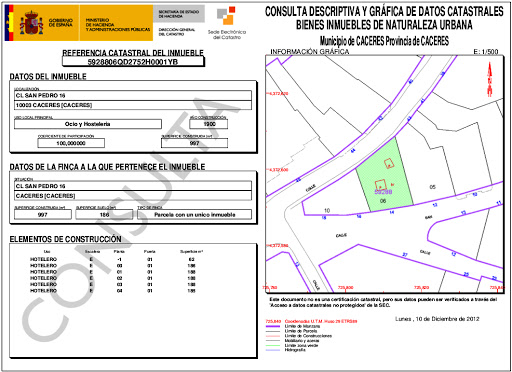 El edificio de Caja de Extremadura en calle de San Pedro, 15 (o Donoso Cortés, 27) no tiene una superficie construida de 1.620 m2 como figura en la ficha pública catastral, sino que su superficie real construida está en torno a los 3.840 m2. Esta curiosidad sería muy interesante para la Hacienda Pública local, porque habría que saber cuál es el importe del IBI (no me extrañaría que hubiera exenciones o bonificaciones por aquello de que la Caja de Ahorros y Monte de Piedad de Cáceres se fundó con la participación del Obispado, si no recuerdo mal).