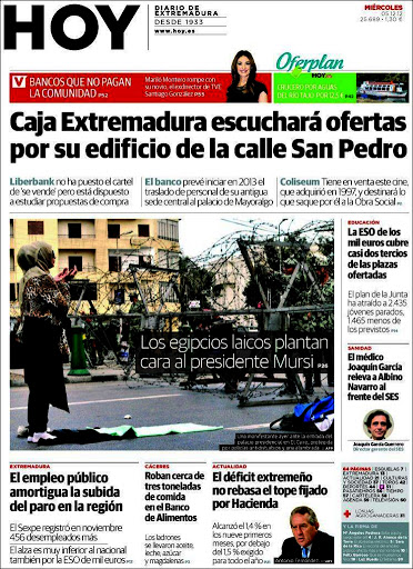 En el día de ayer, 5 de diciembre, la edición en papel del Diario Regional HOY recogía una información con titular deportivo: “Caja Extremadura escuchará ofertas por su edificio de la calle San Pedro”. Vamos, como el Real Madrid por Kaká. La enjundia de la noticia tiene que ver con la intención de llevar a los trabajadores de “la central” de Cáceres de dicha entidad financiera al Palacio de Mayoralgo, a lo largo de 2013, y, mientras ello se produce, “escuchar ofertas” de posibles compradores. Es evidente que se vende mejor un edificio que está en uso que uno vacío y abandonado. No es mala estrategia, aunque el mercado no está ni para estrategias ni para inversiones.
