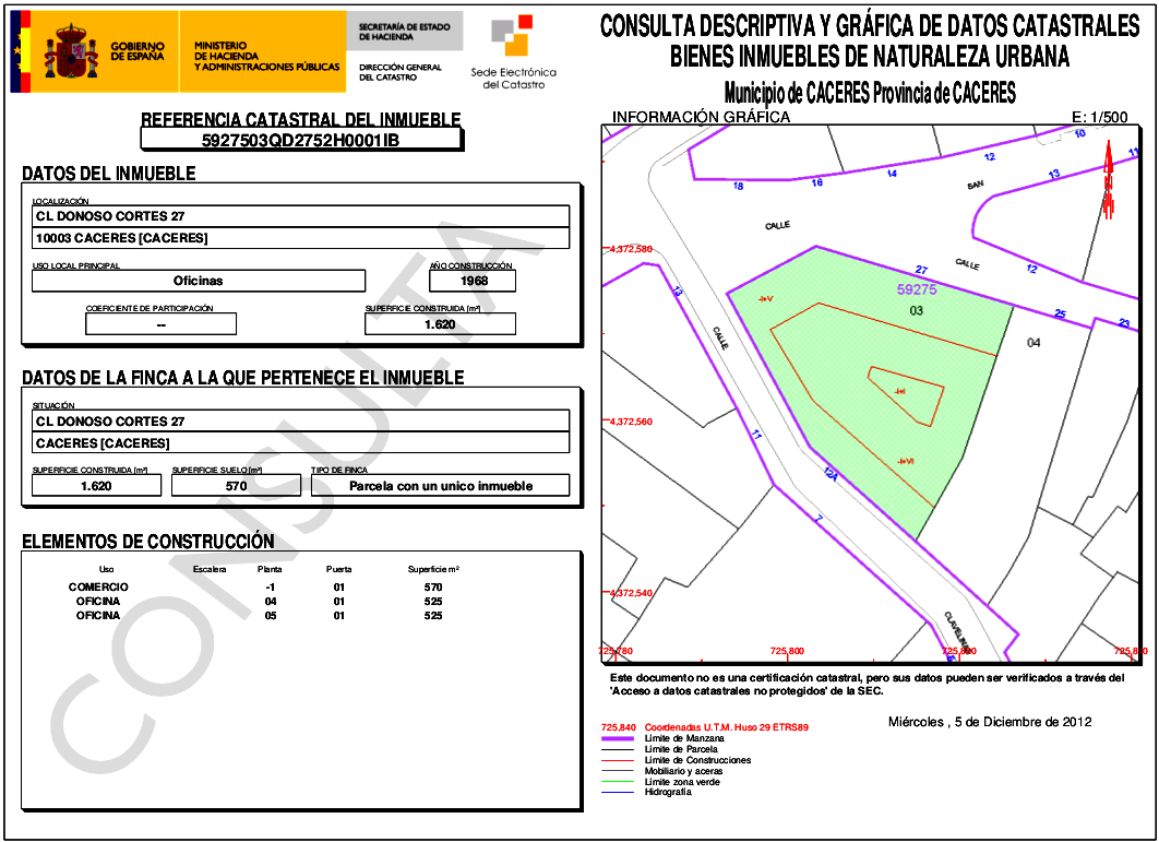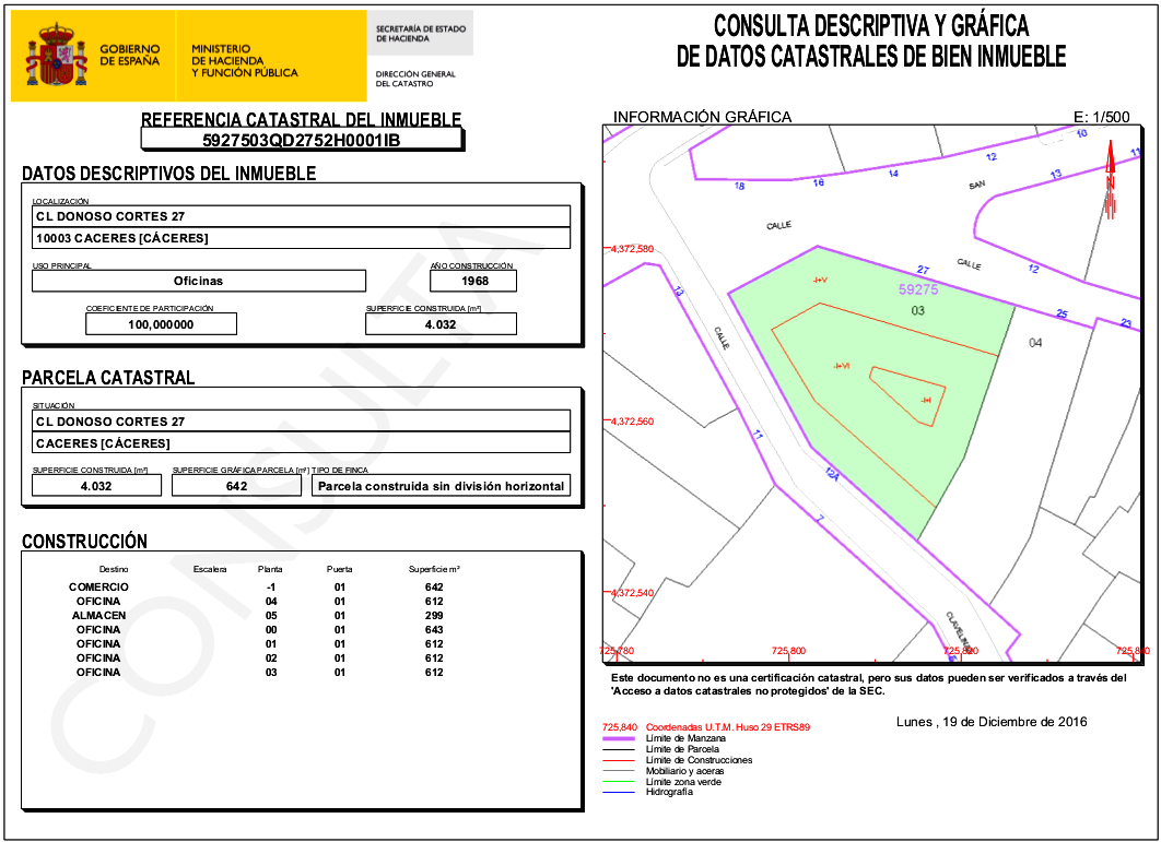 Ya en aquella entrada me refería a que la ficha catastral disponible en la web pública del Catastro se refería a un inmueble con una superficie construida de 1.620 m2. Y también el Catastro señalaba el año de construcción: 1968. Ha de entenderse, por tanto, que ese inmueble debería estar incluido en el correspondiente censo de Contribución Urbana (ahora, Impuesto de Bienes Inmuebles) devengando el gravamen referido a los 1.620 m2.