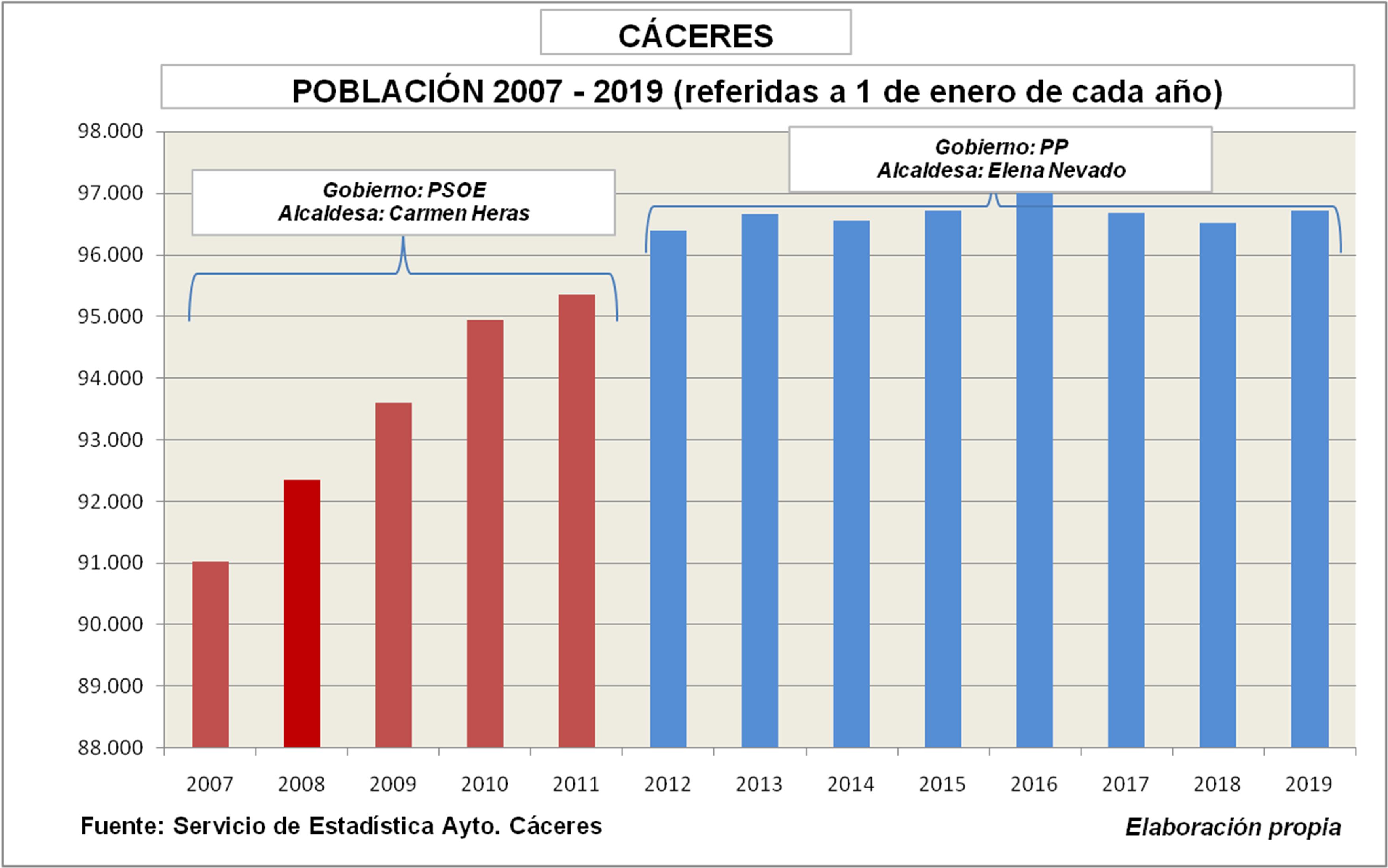 Hoy, se ha publicado el final de un litigio Ayuntamiento Vs Induyco (El Corte Inglés) por unos terrenos del sector “Vegas del Mocho”. Por otra parte, hace unos días tuve la curiosidad de estudiar los datos estadísticos de población publicados en el web municipal: entre 1 de enero de 2012 y 1 de enero de 2019, la población de la ciudad ha crecido en solo 321 habitantes, por lo que alcanzar la cifra psicológica de los 100.000 habs se difumina en el futuro.