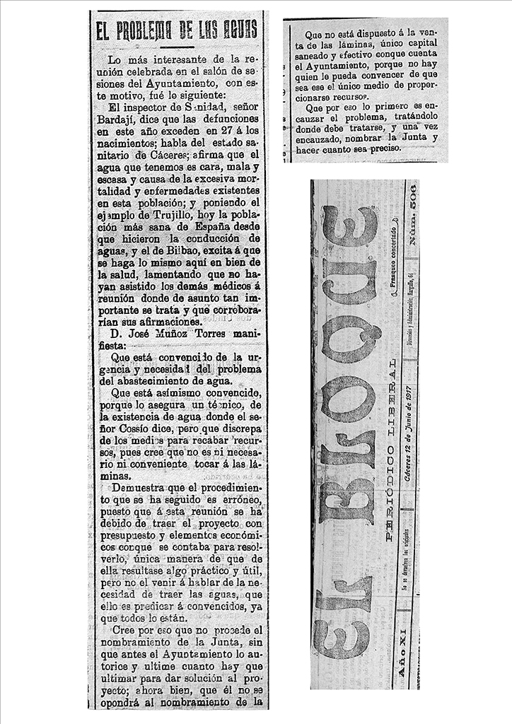 El Periódico liberal El Bloque informaba, en su edición de 12 de junio de 1917, bajo el expresivo titular “El problema de las aguas”, en relación con el Informe del ingeniero Pérez-Cossío de la reunión celebrada en el Ayuntamiento, donde se expusieron, entre otras cuestiones, la insuficiencia del mismo y de una previsión económica que desaconsejaba continuar con la idea, no obstante lo cual se plantearon nuevas aportaciones al informe en 2018.