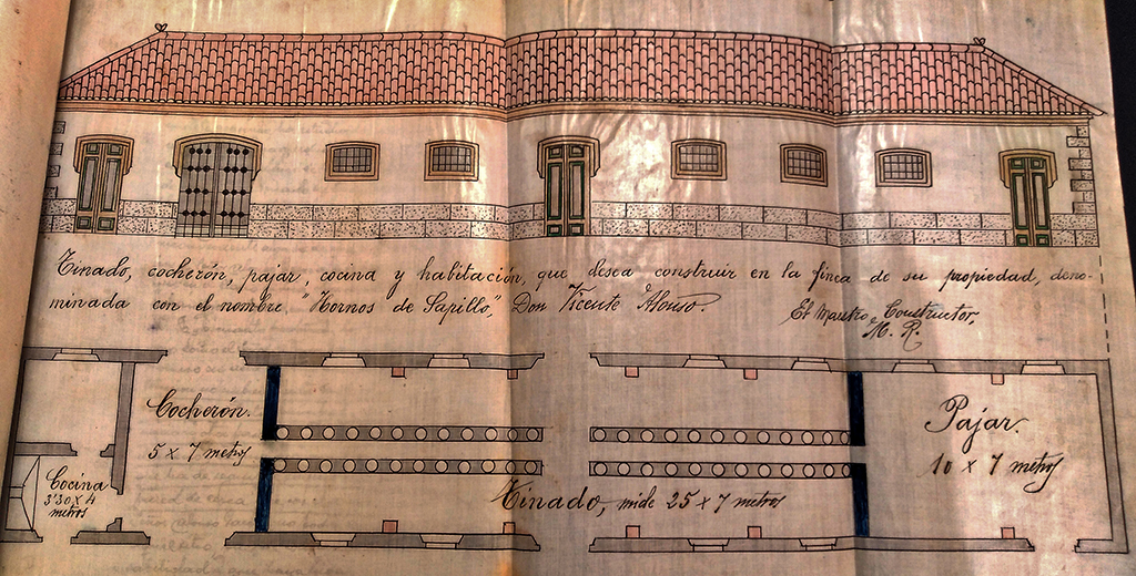 La otra, de 1921, por la que don Vicente Alonso García solicita licencia para construir un tinado en sitio “El Sapillo”, lindando con la carretera del marco (20/56 Expediente 84). La solicitud de licencia de construcción lo es para “un cocherón, pajar y habitación que desea construir en la finca de su propiedad”. Se acompaña un plano de alzado y planta, firmado por el Maestro Constructor M.R., sin incluir referencia gráfica al encauzamiento.