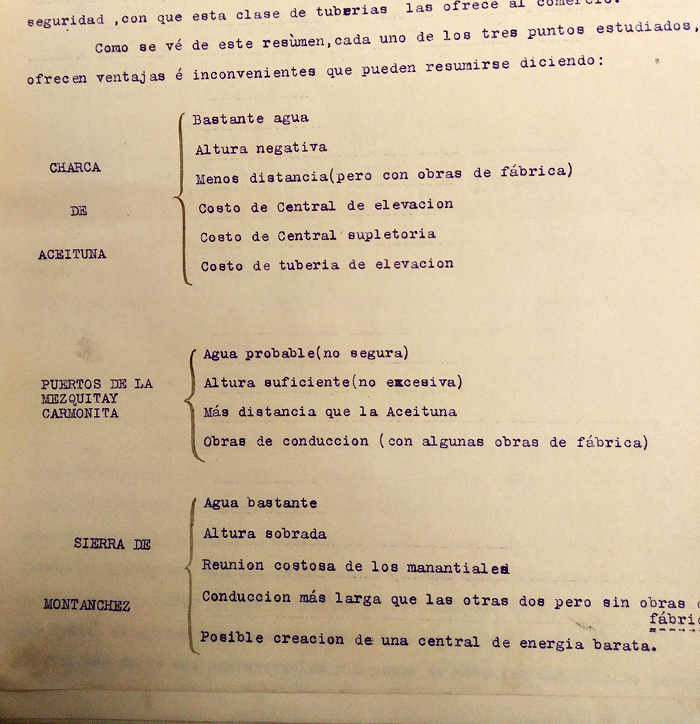No obstante, el Ingeniero Pérez-Cossío identificó tres puntos desde los que acometer el abastecimiento: la Charca de la Aceitunilla, el Puerto de la Mezquita y Carmonita y la Sierra de Montánchez.