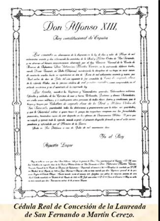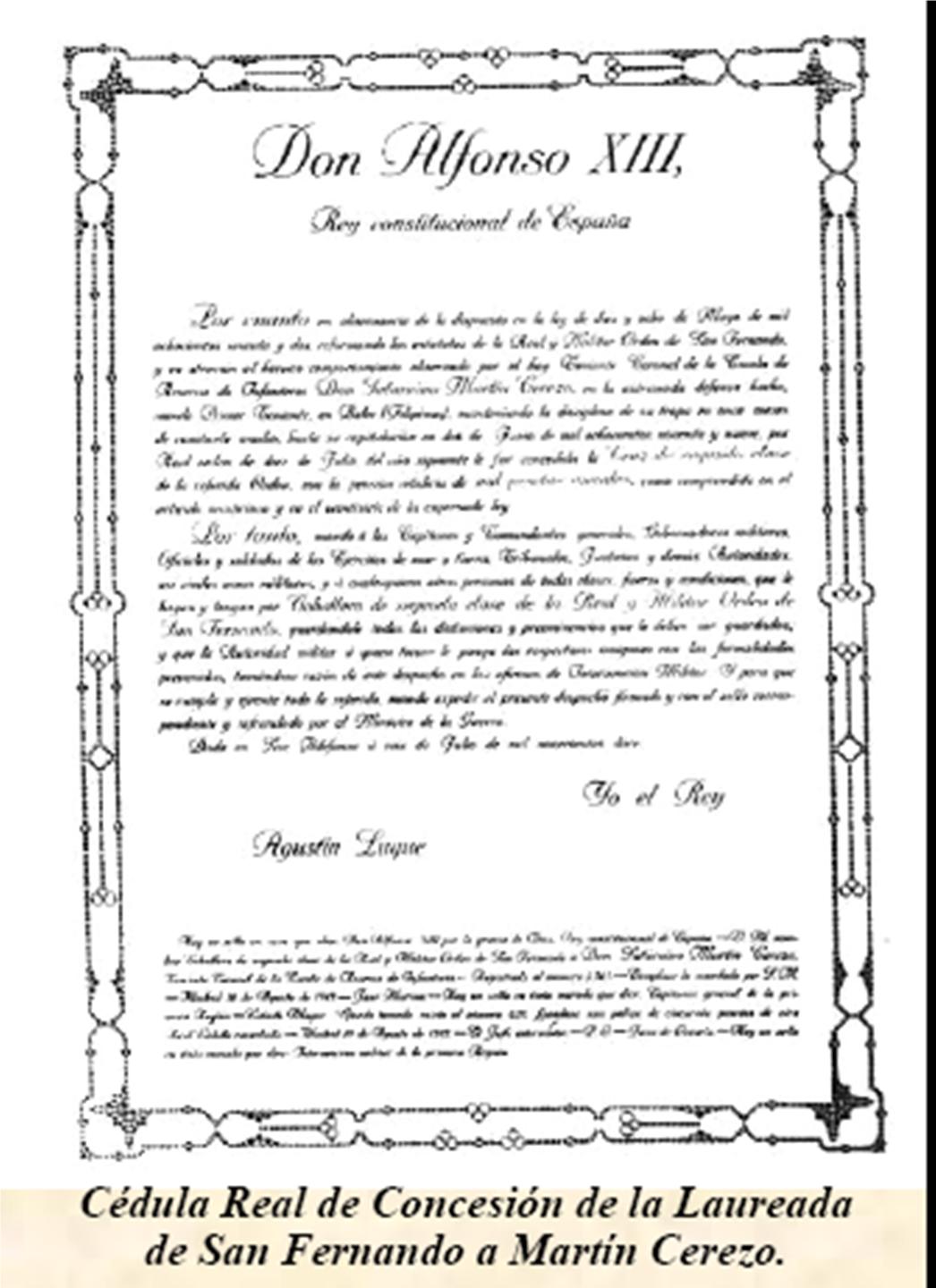 Entre esos homenajes y reconocimientos a la figura de Martín Cerezo está la concesión, en Julio de 1901, de la Cruz Laureada de San Fernando, mediante cédula real y tras el correspondiente y preceptivo juicio contradictorio.