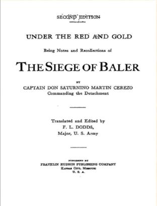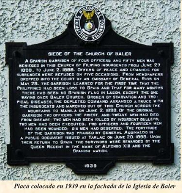 “Una guarnición española de cuatro oficiales y cincuentas solda-dos fue sitiada por los insurgentes filipinos entre el 27 de junio de 1898 y el 2 de junio de 1899. Los ofrecimientos de paz y las peticiones de rendición fueron rechazados cinco veces. Los sitiados supieron por los periódicos dejados en el patio por un emisario del general Ríos que España había perdido Filipinas. Durante muchos meses la única bandera de España que ondeó en Luzón fue esta de la iglesia de Baler. Rotos por la desnutrición y las enfermedades tropicales, el mando español negoció una tregua con los rebeldes y los sitiados pudieron abandonar la iglesia para cruzar los montes. Dos oficiales y doce hombres murieron como consecuencia de las enfermedades, dos fueron ejecutados, dos oficiales y catorce soldados habían resultado heridos, seis desertaron. La valentía de la guarnición fue reconocida por el general Aguinaldo en documento oficial hecho público en Tarlac el 2 de junio de 1899. A su regreso a España los últimos de Filipinas fueron premiados por la Reina Regente, María Cristina, en nombre del Rey Alfonso XIII y la nación española.”