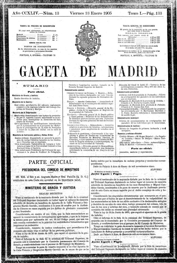 Así, el día 13 de enero de 1905, la Gaceta de Madrid (el actual Boletín del Estado) incluía en su primera página el Real Decreto por el que se concedía la conmutación de la condena a muerte por la pena de cadena perpetua para ambos reos.
