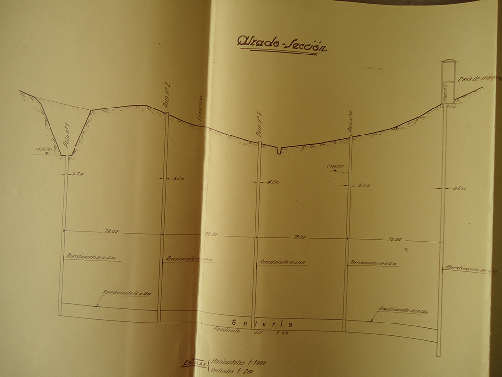 La captación de aguas se hacía desde cuatro pozos, conectados entre sí por una galería de 1 metro de anchura y una altura hasta el centro de la curva superior de 1,70 metros. Esa galería conectaba los pozos del uno al cuatro. Los dos primeros situados fuera de la Cerca de Don Jorge o cerca de los pozos, como la conocíamos los muchachos del barrio.
