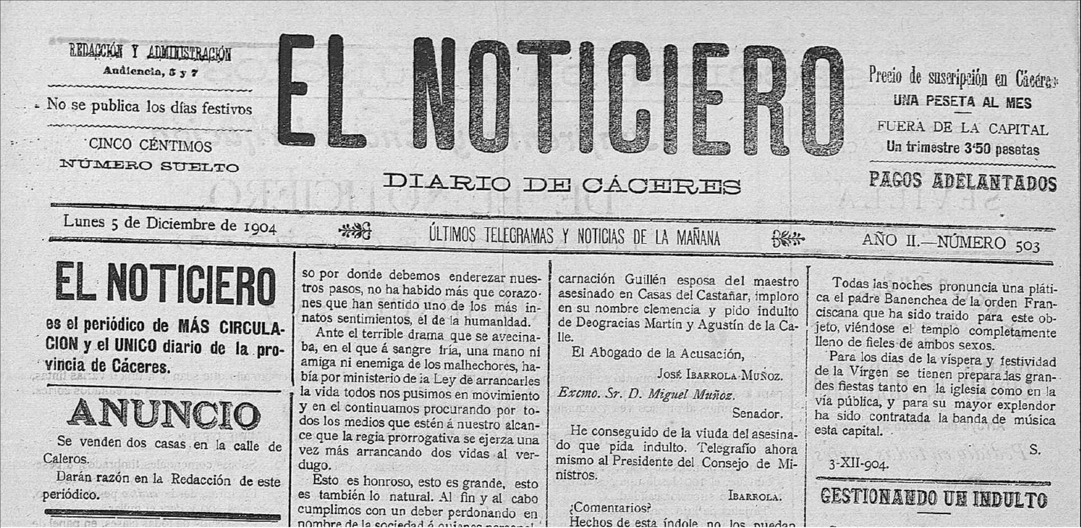 En El Noticiero, diario de Cáceres, de 5 de diciembre de 1904, encontramos las informaciones que sobre la petición de indulto se iban conociendo. Y ello, según el mismo periódico, por tratarse de un asunto en el que existía pleno consenso social. Así lo contaba El Noticiero.