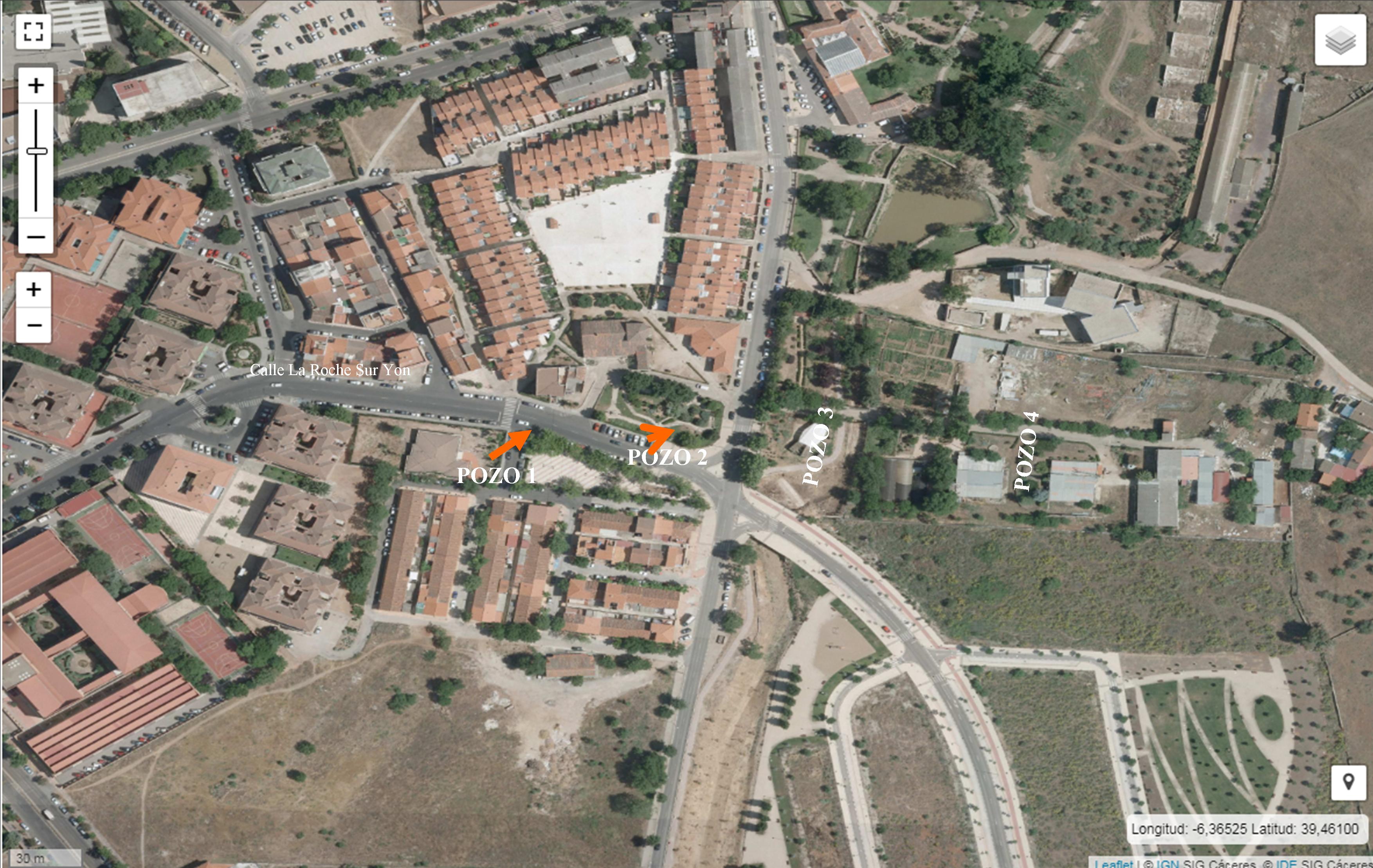 El pozo número 1 estaba situado en la margen izquierda del camino que desde la Ronda de San Francisco llegaba hasta la carretera de Medellín. Un camino de tierra que es hoy la calle de La Roche Sur Yon. Su ubicación coincidiría actualmente con la intersección de la calle que delimita el colegio DOWN, desde La Roche Sur Yon hasta el grupo de viviendas construidas por el Ayuntamiento a finales de los años 50, y que a continuación tenía el llamado campo de fútbol del Espiri, anterior en su origen al de Cabezarrubia.