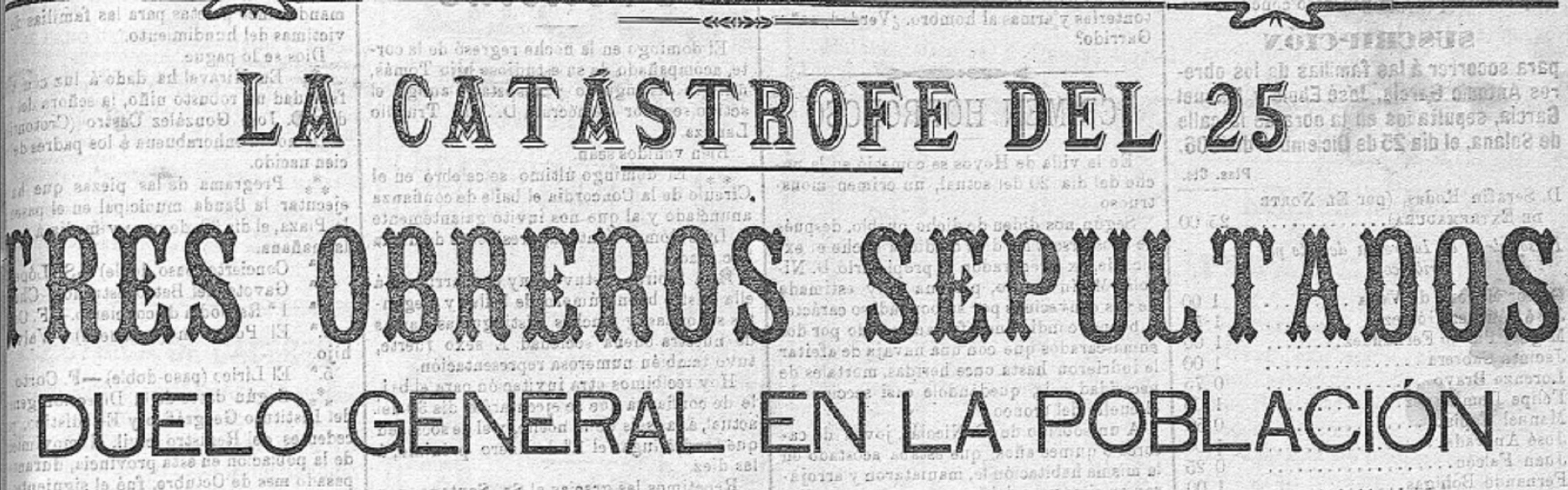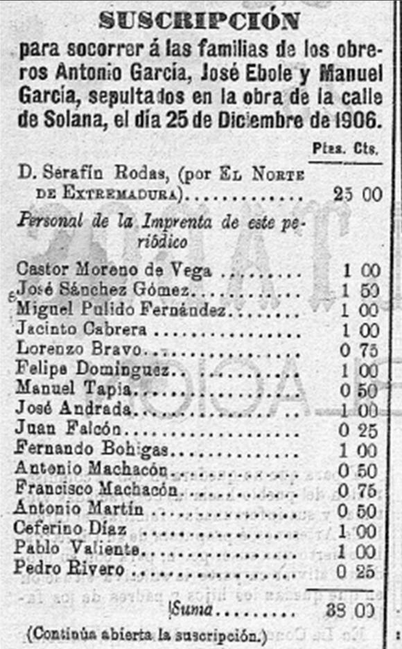 El 25 de diciembre de 1906 se produjo en Cáceres un accidente laboral en el que perdieron la vida tres trabajadores de la construcción, al producirse un desprendimiento de tierras en la calle de la Solana, actual calle de Pizarro. Por la fecha en que se produjo el siniestro, tuvo una gran repercusión, como ya se ha contado en este sitio.