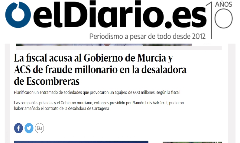 “Apuntan a que se planificó coordinadamente entre el Ente Público del Agua (EPA) del Gobierno de Murcia y las sociedades mercantiles privadas investigadas (Hidromanagement S.L. y Grupo Cobra/ACS) todo un esquema de contratos y sociedades constituidas cronológicamente según un orden aparentemente disociado entre lo público y lo privado, aunque en realidad parecen obedecer a un diseño único, para conseguir que se construyese una planta desaladora en el valle de Escombreras”, se puede leer en el documento del pasado 13 de julio.