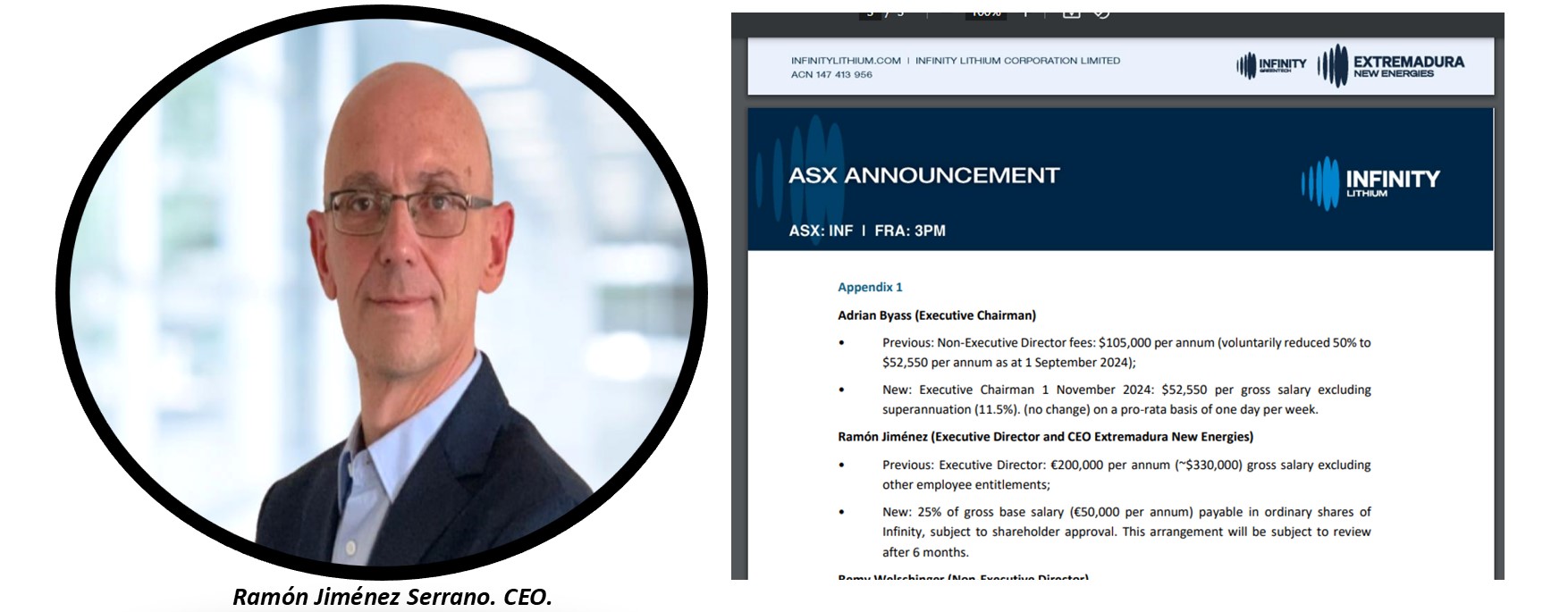 Dado que las primeras páginas del Estudio de Impacto Ambiental que el jefe del sicariato cacereño al servicio de la especuladora australiana ha censurado, estimo, en justa correspondencia, colocar aquí su fotografía, obtenida de la propia web corporativa, y al lado las retribuciones que pasará a percibir a partir del 16 de noviembre próximo, cuando se aprueben en la Junta General de Accionistas.
