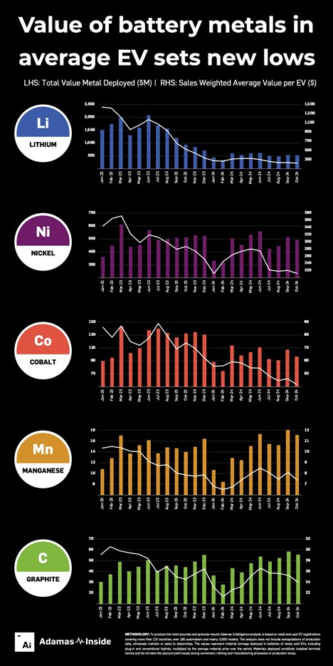 A medida que los precios del grafito natural y sintético, el carbonato e hidróxido de litio y el sulfato de níquel, cobalto y manganeso siguen cayendo, la factura de materias primas para el vehículo eléctrico promedio ahora se redujo a $ 510 en comparación con los $ 918 en octubre de 2023 y un pico mensual de más de $ 1,900 a principios del año pasado, según el análisis de Adamas Intelligence.