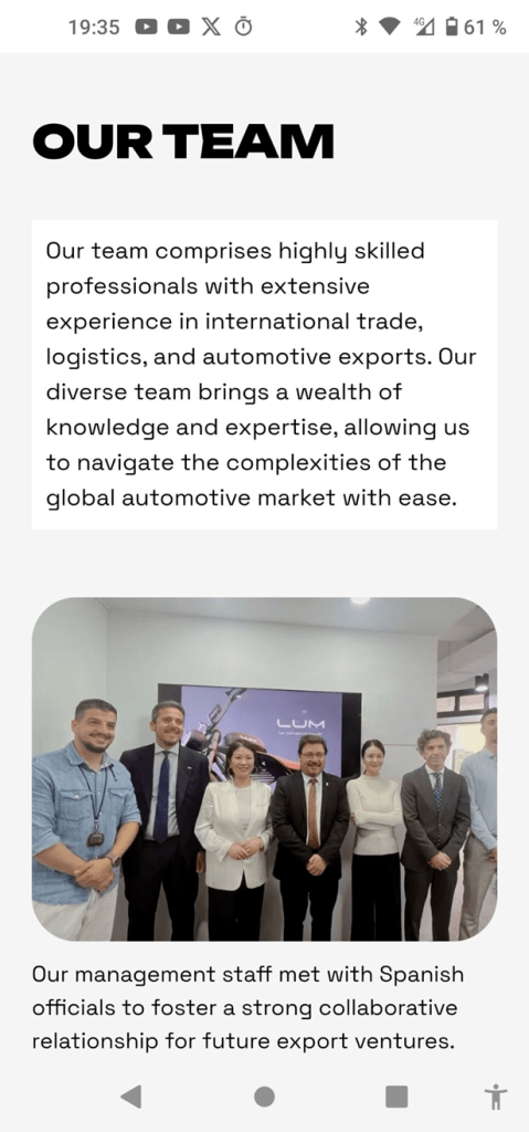 “Our team comprises highly skilled professionals with extensive experience in international trade, logistics, and automotive exports. Our diverse team brings a wealth of knowledge and expertise, allowing us to navigate the complexities of the global automotive market with ease.”