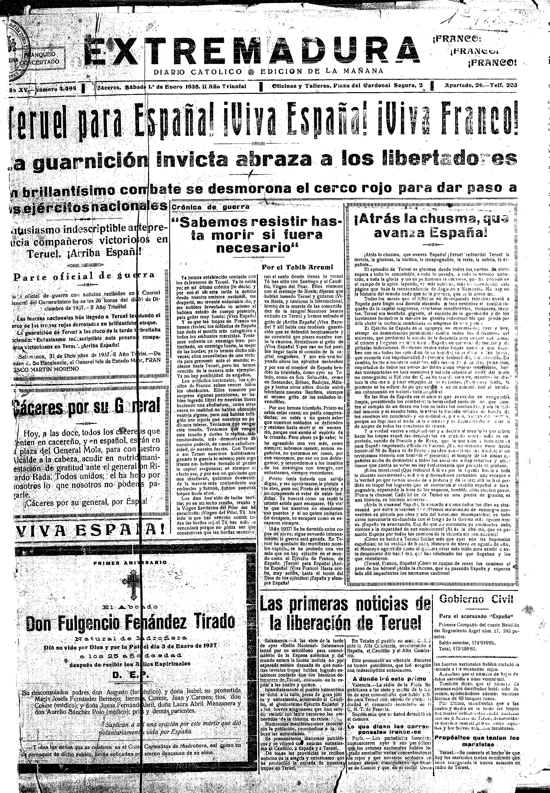 Recomiendo al director o directora del Extremadura que publique en esa serie anecdótica sobre lo bonito que fue el paso del fascismo por esta tierra la primera página de su edición del 1 de enero de 1938.