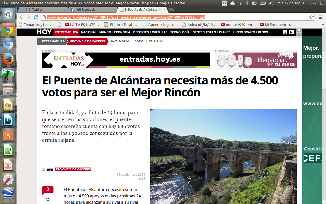 Claro está que, como todo el mundo dice ahora en Extremadura, el Puente de Alcántara iba ganando de largo. En concreto, el día 15 de septiembre, según informaba el Diario Regional Hoy (http://www.hoy.es/prov-caceres/201409/15/puente-alcantara-necesita-votos-20140915181835.html ) al sitio cacereño le faltaban 4.500 votos. Eso, 24 horas antes del cierre de las votaciones.
