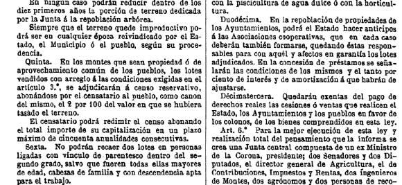 Art. 6º Para la mejor ejecución de esta ley y realización total del pensamiento que la informa, se crea una Junta Central, compuesta de un exministro de la Corona, presidente; dos senadores, el diputado, el director general de Agricultura, el de Contribuciones, Impuestos y Rentas, dos ingenieros de montes y dos agrónomos.