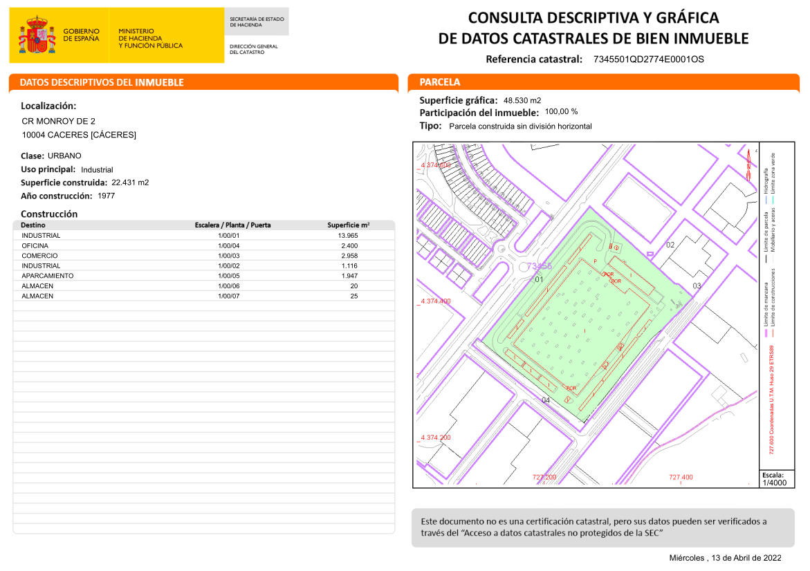 La fábrica tenía una superficie construida de 22.431 m2, sobre una superficie de suelo de 48.530 m2, esto es, una relación construido/suelo de 0,46 m2, y con la denominación urbanística de suelo de uso industrial.