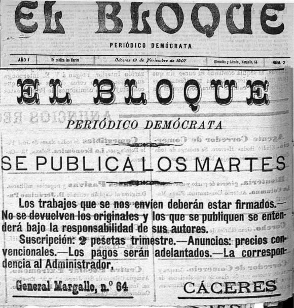 Cabecera y razón social de El Bloque, periódico demócrata. Cáceres. 1907